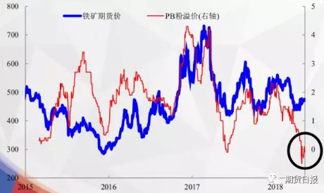而高品位PB粉的溢價(jià)又與鐵礦石期貨價(jià)格呈現(xiàn)很強(qiáng)的正相關(guān)性(見下圖),前期PB粉溢價(jià)已經(jīng)跌落到負(fù)值,意味著市場(chǎng)已經(jīng)極度悲觀,從而引發(fā)階段性預(yù)期修復(fù)行情。